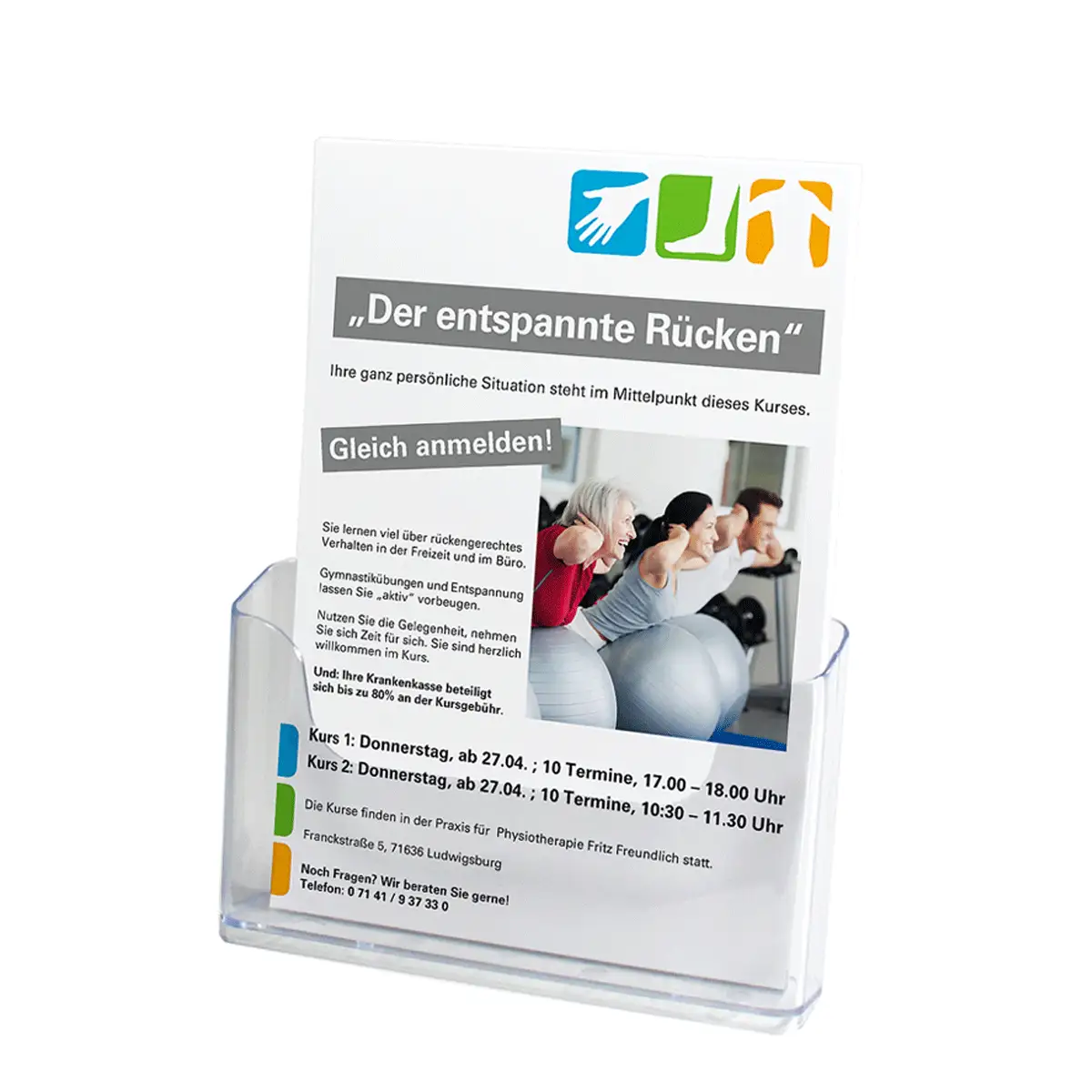 Stellen Sie Ihren Patienten und Kunden jederzeit Informationen in Form von Flyern oder Broschüren zur Verfügung. Für eine ordentliche Präsentation ist das Magazin aus transparentem Kunststoff im Format DIN A4 mit einem Fach ideal geeignet.